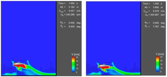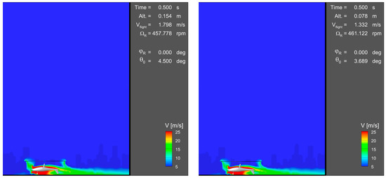Figure 11, Figure 12 and Figure 13 present snapshots of velocity magnitude contours around the gyroplane, taken during the classic takeoff simulation at t = 0, 10, 17.5 s (time elapsed from the beginning of run on a runway), for two compared flight control strategies: baseline and optimized.