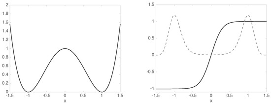 Left: double-well potential. Right: invariant distribution (gray dashed) and second eigenfunction (solid black) of the associated transfer operator .