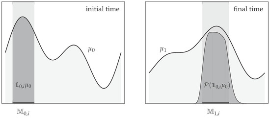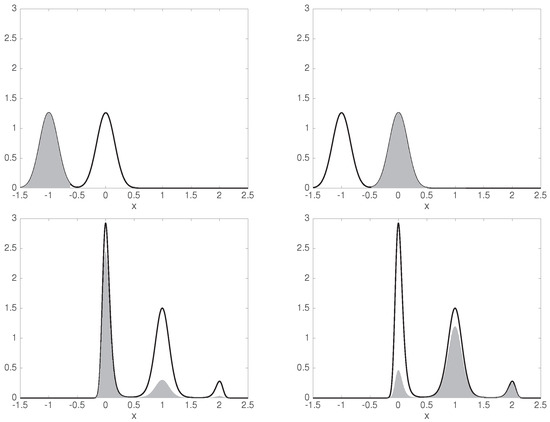We denote by the space (equivalence class) of q-integrable functions with respect to the Lebesgue measure. denotes the same space of function, now integrable with respect to the weight function . All our transfer operators are well-defined non-expanding operators on the following Hilbert spaces: , , and [31,32,33]. The equilibrium density satisfies , that is, is an eigenfunction of with associated eigenvalue . The definition of relies on , we have