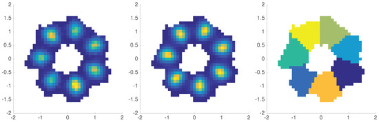 Left: empirical distribution of the (histogram with bins). Middle: corrected invariant distribution. Right: clustering of the populated partition elements based on the 7 dominant eigenfunctions of the low-rank GMSM.