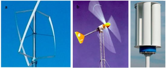 Different types of micro wind turbine: (a) Twisted H-Darrieus VAWT; (b) Three-blade propeller HAWT; (c) Savonius VAWT [].