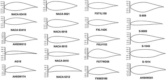 Mohamed et al. [] used CFD based on the SST k-ω and Realisable k-ε models in order to investigate 25 different types of blade aerofoil sections and blade pitch angles (−10–10°) of a small H-rotor Darrieus turbine. The results showed that LS (1)-0413 aerofoil had a power coefficient 10% higher than the NACA 0018. In another study [], the same author compared the performance of 20 different symmetrical and unsymmetrical aerofoil shapes (Figure 5) to maximise the power and torque coefficient. The results indicated that the S-1046 aerofoil section led to a 27% increase in maximum power output coefficient compared to the standard symmetrical NACA aerofoils. Elkhoury et al. [] used CFD based on LES or large eddy simulation with the dynamic SGS or Smagorinsky–Subgrid scale model to investigate the micro VAWT’s performance with variable-pitch. The variable-pitch mechanism was simulated using the sliding mesh method. The results showed that thicker aerofoils had improved performance for the studied high-solidity ratio fixed pitch wind turbine. Furthermore, good consistency was seen among the LES numerical model and experimental results, both for the variable and fixed pitch mechanisms as detailed in Figure 6.