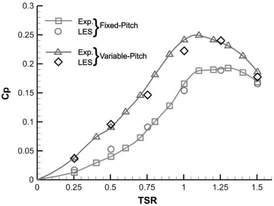 Comparison between experiment and CFD LES model prediction of the average power coefficient for an adjustable- and fixed-pitch angle, NACA0018 [].