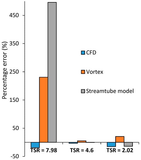 Error of the predicted power by CFD, stream-tube, vortex methods from the experiments at several tip speed ratios (TSR) [].
