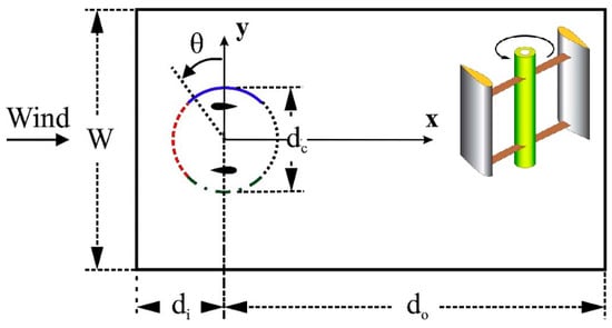 Accurate prediction of the performance of turbines by means of CFD necessitates an adequately fine grid or mesh resolution and azimuthal increment in order to capture important flow details. The size of the computational domains also requires to be adequately large to minimise the impact of blockage caused by the device in the domain. The work of Rezaeiha et al. [] examined the effect of the aforementioned computational parameters on a small two-bladed VAWT operating at 4.5 tip speed ratio using CFD with the uRANS or unsteady Reynolds averaged Navier–Strokes. Figure 8 shows the sizing of the computational domain. The study highlighted that a distance from the turbine center to the domain inlet di and outlet do of 10 D (10 × diameter of turbine) each, a 20D domain width W and a diameter of the rotating core dc of 1.5D were seen to be safe choices to reduce the effects of blockage and uncertainty in the boundary conditions on the results. Klein et al. [] used CFD modelling to investigate the impact of blockage on the blade performance. The study compared the results of the CFD code with a LLFVW or Lifting Line Free Vortex Wake code and wind tunnel experiment. Good comparison was observed between the numerical and wind tunnel data.