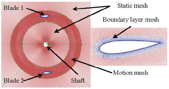 Yang et al. [] examined the effect of tip vortex on small VAWT wake using CFD simulations based on the k omega SST or shear-stress transport model at various TSRs. To accurately study the tip vortex formation, the grid which had a substantial effect on the vortex evolution was concentrated in the rotor blade area, as shown in Figure 9. The vortex structure distribution was more complex with the span wise direction at a lower TSR and the tip vortex had an extended dissipation distance at a high TSR. Moreover, the average wind velocity results demonstrated a small value beside the blade and large value behind the blade tip, due to the vortex effect.