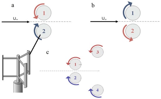 Several recent studies (Bremseth and Duraisamy [], Dabiri [], Giorgetti et al. []) suggested that unlike HAWTs, VAWTs demand less stringent spacing requirements and optimising the positioning and rotation (co-/counter-rotating) of the closely spaced multi VAWT arrangement, could lead to improved performance. Giorgetti et al. [] used CFD to investigate the enhancement in power that can be achieved by setting medium to high solidity and thus low TSR Darrieus micro turbines in close proximity. CFD simulations were conducted to assess the aerodynamic interferences in two- and four-rotor formations as shown in Figure 10. In addition, the performance of counter-rotating and co-rotating arrangements was compared. The results of the simulations demonstrated a rise in production of around 10% as compared to an isolated turbine. The study concluded that acceleration of the freestream flow among the turbines was the reason of the improvement of power extraction through re-energisation and contraction of the turbine wakes.