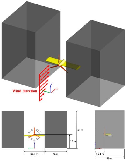 Configuration of the 110-kW wind turbine and buildings with a sky bridge studied in [].