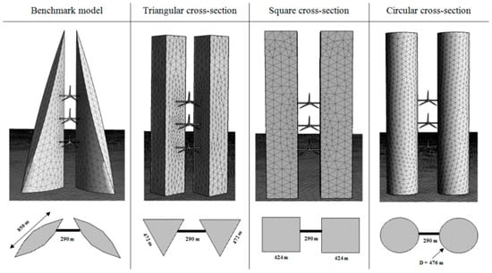 A similar study by Chaudhry et al. [] also used CFD to analyse the efficiency of BAWT but focused on the shape or structural morphology of the building. The performance of the turbines integrated into buildings with triangular, square and circular cross-sections (see Figure 14) was analysed and compared with a benchmark model which was based on the Bahrain Trade Centre. Based on the simulated conditions, the results showed that the circular building shape was the most effective orientation, particularly in the areas with a dominant wind direction. Wang et al. [] established the relationship between potential of wind energy and two perpendicular building configurations (converging and diverging) by conducting CFD analysis. The results showed that, in a converging configuration, the wind energy potential at the rooftop normally increased when the corner separation became bigger, while in a separating configuration, it decreased gradually with corner enlargement. Veena et al. [] conducted research on the optimal sitting of wind turbines with high rise buildings using CFD simulations. Two configurations were compared: wind turbines in between twin towers and building with roof top wind turbines. The use of realistic wind profiles gathered from a weather projection model was the focus of the study. Results have shown that for a standalone high-rise building, there was a substantial fraction on which winds were enough to be used in wind power production. In the case of twin buildings, WTs wind can be positioned also in between the buildings and not only at the roof top. The velocity of 2 m/s can be achieved for a separation distance of fraction 0.2 and 2–2.8 m/s for 0.5.