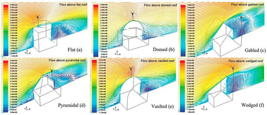 Vertical stream wise velocity path lines along the central plan for the investigated roof shapes [].