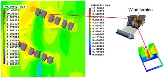 Several studies focused on the impact of surrounding buildings on the performance of BIWT [,,,,]. Zhou et al. [] focused on finding the most efficient and effective design that could accelerate the speed of wind flow for wind turbines in low-rise residential buildings. Figure 16 shows an example of the wind amplification effect of the designed building shape in a sample building. According to the assessment between different building shapes and CFD assessment using Phoenics software, the building shape of composite prism can enable the harvesting of most of the wind power. The tested building shape was later tested in a simulated environment of a residential area in China. The long-term community system, local wind conditions, and the comfort level needed were all considered in the simulation model. The result of the study showed that using wind energy harvesting in low rise residential buildings by adopting the proposed building composite prism shape has a great potential.