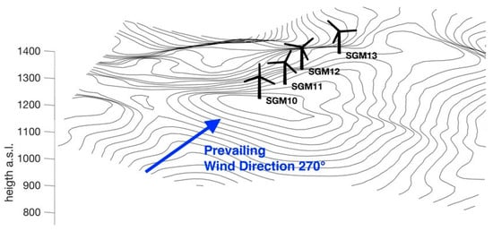 The cost of onshore wind turbine energy production is amongst the lowest, although it is often positioned in complex terrains where there is uncertainty in terms of the available wind resources due to the surrounding topography []. Full-size turbines in a complex topography was studied by Castellani et al. [] using CFD and experiments. The aim of their research was to test the vibrations at the structure and drive train level. Figure 17 demonstrates the inter-turbine distance and layout of the sub-cluster in in the study. The data was gathered through the on-board situation examining system were assessed and considering wind situations and working constraints gathered by the supervisory control and data acquisition (SCADA) [,]. CFD simulation was used, which allowed for better interpretation of the vibration assessment. The most important result was the interpretation of how wakes and flow turbulences appear in the vibration signals, at the structural and drive train levels. Hence, this wind to gear system created links among flow and mechanical phenomena in the aspect of vibrations, indicating an important tool for analysing loads in various working conditions. In another study, Castellani et al. [] investigated the combined impact of wakes and terrain-driven flow on the performance of WT. The subcluster of four turbines in a very complex terrain was evaluated through CFD simulations and experimental SCADA data mining. Researchers within the Project Wakebench developed a framework for the evaluation of wind farm flow models operating at the micro-scale level. The study [,] highlighted the verification and validation method applied to wake models of wind farm including benchmarking and data processing methods for SCADA datasets.