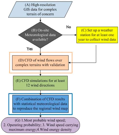 Yan and Li [] proposed an integrated CFD/on-site measurement-based method to simulate the spatial changes of wind velocity for different areas with complex terrains. Figure 18 shows the methodology for potential wind energy assessment. The wind resource assessment involved statistical analysis, CFD simulations and on-site measurement. Also, a case study on wind resource assessment for an offshore island with complex terrain structures was equipped with anemometers for long-term wind measurement was implemented. A detailed wind resource map of the offshore island was achieved over the wind data from a single measurement site coupled with the simulations and showed a great use for future wind farm sitting and turbine micro-sitting.