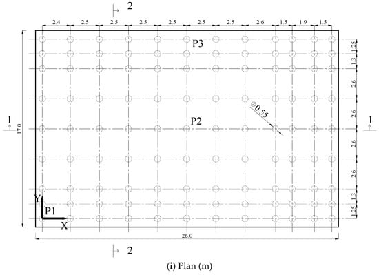 The Nile river water pump station in Sohag city (at the western project in the first Shush Street) consists of a pedestrian bridge with a length of 90 m mounted on 62 piles and a platform with dimensions of 26 m × 17 m as shown in Figure 1. The transfer reinforced concrete plate is 800 mm thick (with upper and lower reinforcement meshes 8φ18/m’ in both directions, rebar chairs φ22/m’ in both directions to hold in position the upper mesh and reinforcement cover 50 mm at top and bottom) and is mounted on 108 piles. Transfer plate structures have the ability to redistribute the loads from the superstructure above to the pile group below, to provide the safe transmission of loads to the pile group and to the soil without the failure of soil or structural elements. The platform is constructed at a distance of 100 m away from the river bank. Each pile has a circular section of 550 mm diameters with steel pipe casing of 20 mm thick. The pile length is 25 m, out of which 14 m are embedded in the river bed. Figure 2 shows the dimensions and the arrangement of piles in the platform, where the distances between piles are not equal. Table 1 represents the geometrical and material properties of the structural elements of the platform and piles. (These values of Young’s modulus of elasticity and Poisson’s ratio for concrete are also used for piles by Chore and Ingle [26]).