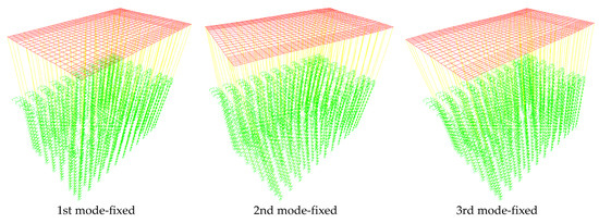 For natural vibration analyses, a total seismic mass including self-weight DL plus 25% of LL (1.0 DL + 0.25 LL) is considered (ACI 318 [27]; ECP-201 [28]). The natural periods and vibration mode shapes are computed by eigenvalue analysis. The values of natural periods are shown in Table 2 for up to the six modes of vibration and the first three vibration modes are shown in Figure 4.