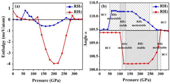 (a) Enthalpy difference of vanadium in Rh1 and Rh2 structures at zero Kelvin with respect to the BCC phase as a function of pressure. (b) Variation of the residual angle α in Rh1 and Rh2 structures as a function of pressure at zero Kelvin. Note that α = 109.47° corresponds to the perfect BCC structure and 1 GPa = 10 kbar.
