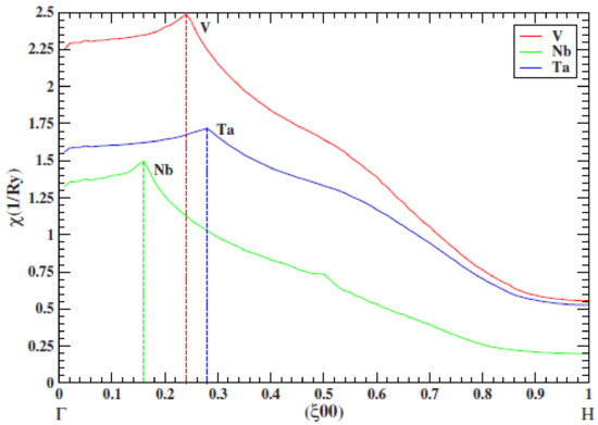 Partial (in the summation over bands, only the third band is included) electron susceptibility of V, Nb, and Ta calculated along the Γ-H direction at ambient pressure [76].