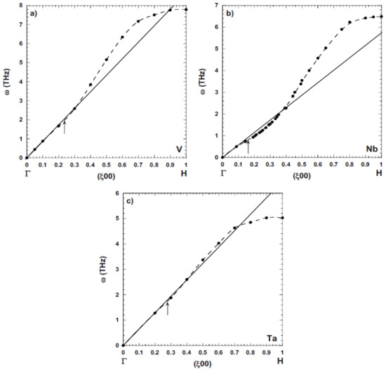 The experimental phonon dispersion TA curve in the (ξ00) direction for (a) V [70,96], (b) Nb [97,98], and (c) Ta [95]. The arrow indicates the Kohn anomaly obtained from ab initio calculations [76]. The straight line represents the elastic constant line.