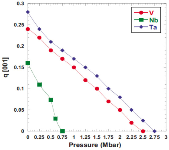 Tracing the pressure dependence of the position of the maximum on the generalized partial susceptibility, Landa et al. [76] plotted (Figure 5) the magnitude of the nesting vector, or the position of the Kohn anomaly, as a function of pressure. These calculations show that the nesting vector decreases as pressure increases and the termination of a so-called “jungle-gym” hole-tube occurs at 2.50, 0.75, and 2.75 Mbar for V, Nb, and Ta, respectively. This is in a good agreement with results of Koči et al. [69] for V and Nb, although their calculations revealed a lower termination pressure for Ta (~2.25 Mbar).