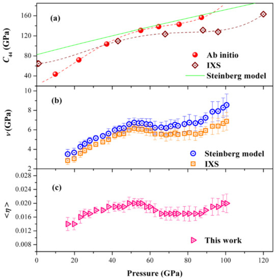 Pressure dependence of the shear modulus C44 (a); yield strength (b); and average microscopic deviatoric strain (η) (c) of Ta. The shear modulus C44 was predicted by theoretical calculations [71] (red dots), deduced from the sound velocity experimentally determined by IXS during DAC [73] (blue diamonds), and extrapolated from the Steinberg model [100] (solid line). Note that 1 GPa = 10 kbar.