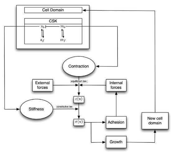 Figure 1 shows a scheme of the different interactions considered in the model: the evolution of the actin and myosin concentrations is governed by means of reaction–diffusion equations; the cellular deformations and stresses are related by means of an elastic constitutive law, where the cell stiffness depends on the actin concentration; the force contraction generated by the cell is due to the myosin bound to the actin; the cell growth during the process is due to the stress generated at the ends of the cell body; and the adhesion/failure is also regulated by the existent stress at the ends, increasing/decreasing the friction with the substrate.