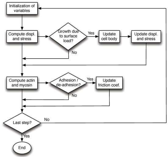 Figure 4 shows a sketch of the numerical method. At each time step, we compute the cell displacement and stress together with the actin and myosin concentrations and we check if some threshold is reached in order to update the corresponding parameters.