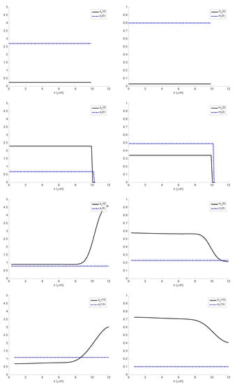 Actin and myosin concentrations during 10 s of the simulation: (Left) bound (solid) and free (dashed) actin concentrations at the initial time and at time instants s; (Right) bound (solid) and free (dashed) myosin concentrations at the initial time and at time instants s.