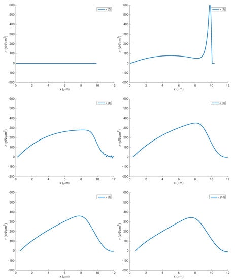 Finally, Figure 6 shows the displacement together with the stress undergone by the cell body during the simulation. Note that the deformation of the cell body is due to the myosin contraction effect during the interval ; after applying the surface load , an increase in the deformation is suffered and, consequently, a growth in the cell domain is produced; finally, during the interval the contraction effect is the responsible for less increase in the cell body length. The final length of the cell body is 10.711 µm, which generates an increase of 0.711 µm in 10 s of simulation.