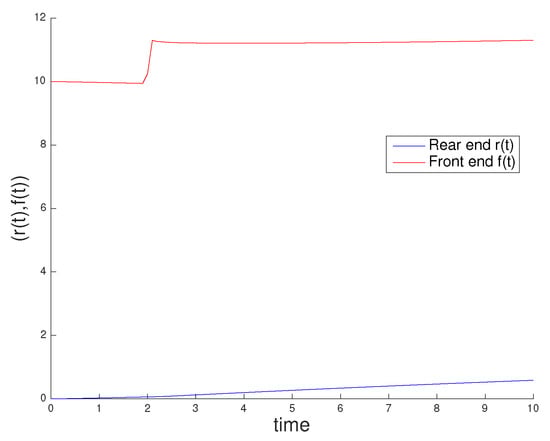 Let be the initial one-dimensional domain corresponding to the cell geometry with the cell length (see Figure 2). We assume that the cell occupies the region at each time instant t, where and denote the rear and front ends, respectively; thus, and .