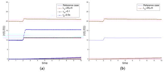 Figure 8 shows the results obtained in these three scenarios, comparing them with the results obtained with the reference case. When increasing the initial cell length, the obtained deformation is analogous to the reference case (the cell contracts up to 2 s, then it grows when the surface load is applied, and finally it suffers from a lower increase due to the contraction effect). When the myosin stress is reduced, the cell barely contracts and the growth in the cell length is greater (1.274 µm in 10 s of simulation). Finally, when delaying the deactivation time from s to s, we obtain similar results to the reference case, but the contraction effect is lower and a growth of 4.658 µm is produced.