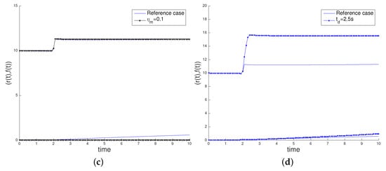 Sensitivity analysis of the proposed model. Time evolution of the rear and front ends of the cell are shown. The solid line corresponds to the reference case introduced in Section 3. (a) reference case and three new scenarios; (b) reference case vs. increased initial cell length; (c) reference case vs. decreased myosin stress; (d) reference case vs. delayed deactivation time.