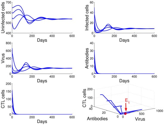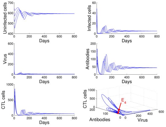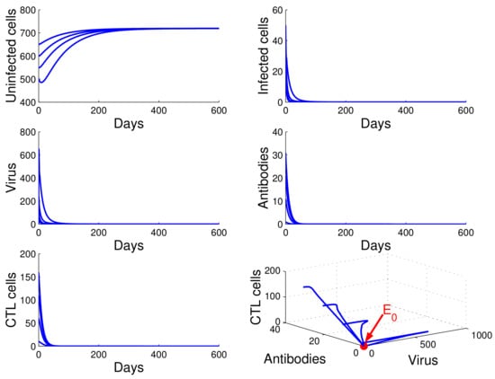 For the case in which , , and , we obtained . It follows from Theorem 2 that Equation (13) has one infection-free equilibrium . From Figure 1, we see that the concentration of uninfected CD4 T cells increased and tended to the value , while the concentrations of infected cells, free HIV particles, antibodies, and CTL cells decreased and tended to zero. This means that is globally asymptotically stable and that the virus will be cleared. This confirms the result in Theorem 3.