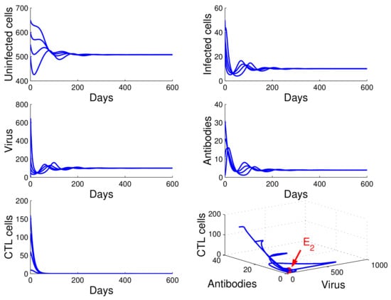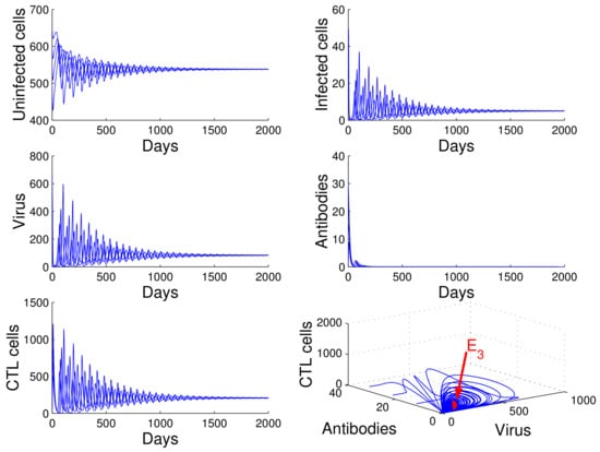For the case in which , , and , we obtained , , and . Using of Theorem 4, we deduce that the infection equilibrium with both arms of immunity is globally asymptotically stable (see Figure 5).