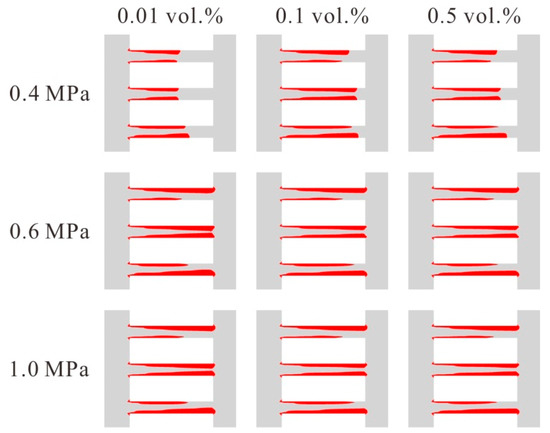 Figure 2 depicts the vapor volume fraction on the symmetric plane of the model for different nanoparticle volume fractions with different inlet pressures. In the figure, the red area represents where the vapor distributes. It is found that the vapor distributes near the wall of the holes. When the inlet pressure is 0.4 MPa, the vapor volume fraction is variable with the nanoparticle volume fraction; while when the inlet pressure is higher, for example 0.6 MPa and 1.0 MPa, the contours of vapor volume fraction are almost the same, which indicates that for a lower inlet pressure, the nanoparticle volume fraction affects the cavitation of the nanofluids, and that for a higher inlet pressure, the cavitation is dominated by the inlet pressure. According to Equation (6), the Cavitation number is inversely dependent on the flow rate. As flow rate increases, the cavitation number decreases, and cavitation becomes more serious. As in the present numerical simulation, the inlet pressure varies from 0.4 MPa to 1.0 MPa, while the outlet pressure is fixed at 0.1 MPa. As the inlet pressure increases, the pressure drop (between outlet and inlet) increases, and thus the flow rate increases. Therefore, the cavitation number decreases to generate cavitation. At relatively higher inlet pressures, the influence of inlet pressure on flow rate plays a significant role to cause cavitation, while the effect of nanoparticle volume fraction on cavitation is kind of hidden by this significant inlet pressure effect.