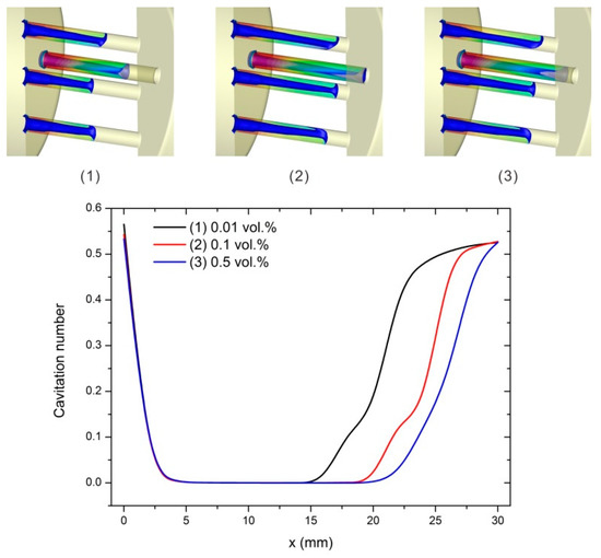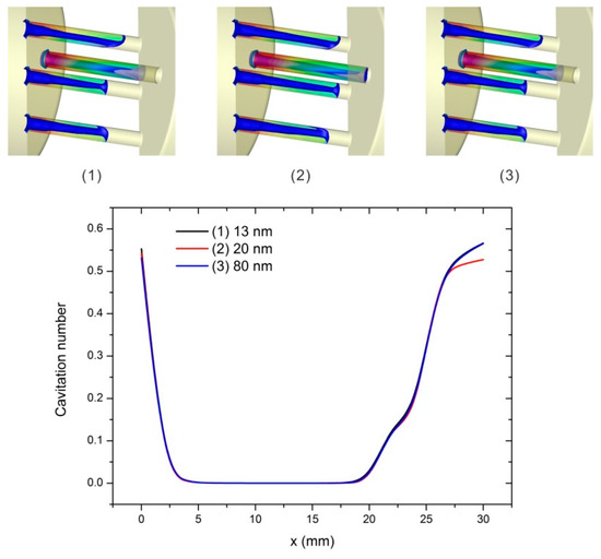 Figure 7 depicts the cavitation number on cross sections of the perforated plate for different nanoparticle diameters. It is found that the three curves almost overlap. It can be obtained that for the fixed inlet pressure 0.4 MPa, the nanoparticle diameter influences the cavitation level insignificantly.