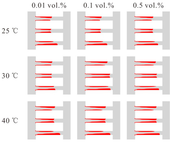 How the nanoparticle volume fraction influences the cavitation with different temperatures has been explored in this section. The nanoparticle volume fractions are set as 0.01%, 0.1% and 0.5%, respectively, and the temperatures are set as 25 °C, 30 °C and 40 °C, respectively. Additionally, the nanoparticle diameter is set as 20 nm, the inlet pressure is set as 0.4 MPa and the outlet pressure is set as 0.1 MPa.