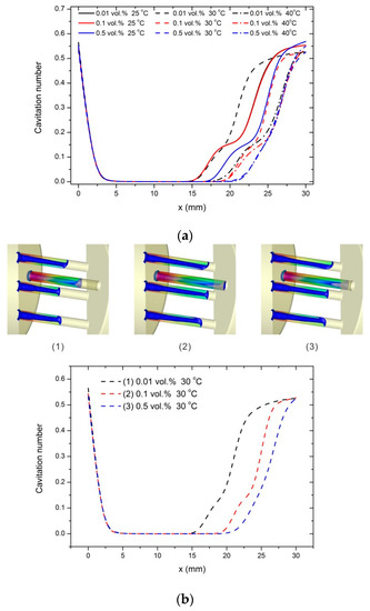 Figure 5a depicted the cavitation number on cross sections of the perforated plates for different nanoparticle volume fractions at different temperatures. These curves are grouped by temperature. It is found that at different temperatures, the section where the cavitation number keeps the minimum is the longest when the nanoparticle volume fraction is 0.5%, which indicates that the cavitation level is the highest. In terms of the other two nanoparticle volume fractions, the section where the cavitation number keeps the minimum is always longer when the nanoparticle volume fraction is 0.1%, and the difference is the largest at 30 °C, as shown in