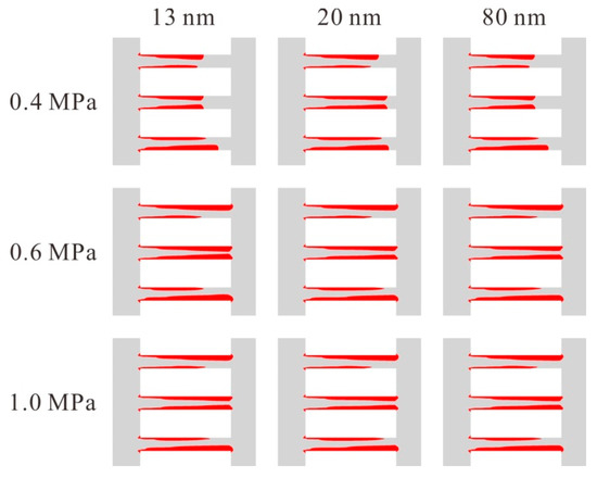 Figure 6 shows the vapor distribution on the symmetric plane of the model. It is found that when the inlet pressure is 0.4 MPa, the vapor volume fraction changes with the nanoparticle diameter. When the inlet pressures are 0.6 MPa and 1.0 MPa, the distribution of the vapor is almost the same. It indicates that for a low inlet pressure, the nanoparticle diameter impacts on the cavitation, while for a high inlet pressure, the cavitation is mainly dominated by the inlet pressure.