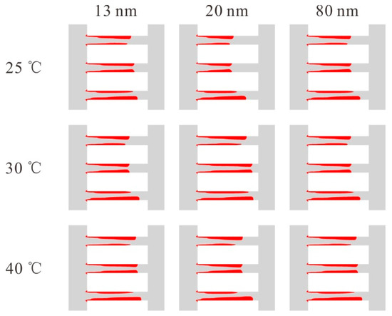 The effects of the nanoparticle diameter on the cavitation at different temperatures have been explored in this section. The nanoparticle diameters are set as 13 nm, 20 nm and 80 nm, respectively, and the temperatures are set as 25 °C, 30 °C and 40 °C, respectively. Additionally, the nanoparticle volume fraction is set as 0.1%, the inlet pressure is set as 0.4 MPa, and the outlet pressure is set as 0.1 MPa.
