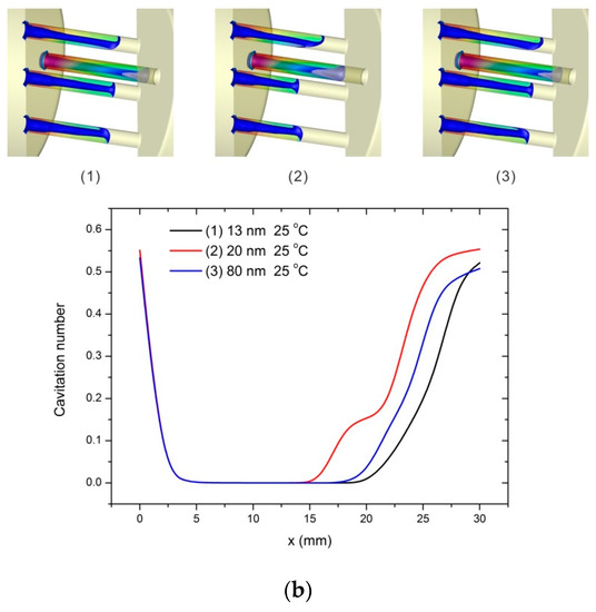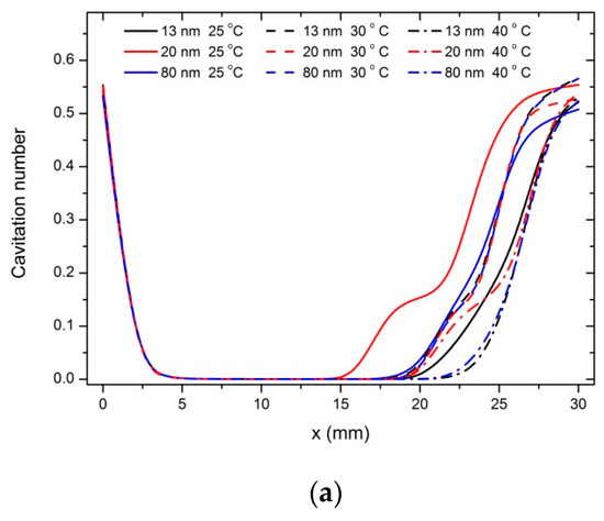 Figure 9a shows the cavitation number on cross sections of the perforated plate for different nanoparticle diameters at different temperatures, and the curves are grouped by temperature. It can be found that when the temperature is 25 °C, the difference of cavitation number for different nanoparticle diameters is the most obvious, as shown in