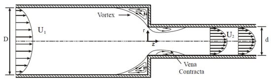 Even though the geometry is simple, these entry flows show complex flow patterns []. When a fluid flows through a sudden contraction, a stationary flow vortex is present in the corner of the upstream tube and the contraction plane. It reduces the available flow area and the fluid accelerates and results in a partially developed velocity profile at the entrance of the downstream tube. In turbulent flow there is a marked drop in pressure as the fluid passes through the contraction. The pressure loss is due to an increase in velocity and the loss of energy in turbulence. There is a rise in pressure at the upstream corner of the contraction due to streamline curvature so that the centrifugal action causes the pressure at the pipe wall to be greater than in the center of the stream. The streamlines continue to curve downstream of the contraction to form a cross section where a minimum pressure and maximum velocity are obtained. This region is known as the vena contracta. The contracted flowing stream is surrounded by fluid that is in a state of turbulence but has very little forward motion. Downstream of the vena contracta the flow stream expands, the velocity decreases and the pressure rises []. Associated with these changes in pressure loss are increased erosion rates as well as increased heat and mass transfer rates in the regions where separated flow occurs.