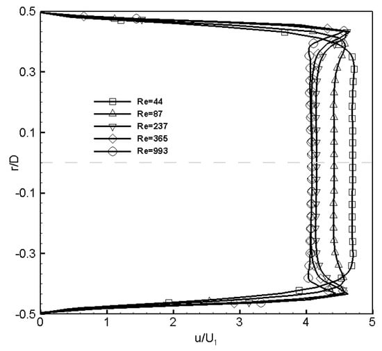 The velocity profile at the inlet of the downstream pipe changes with Reynolds number. This velocity profile shows velocity maxima close to the pipe walls (velocity overshoot) and a flat distribution of velocity in the center part of the pipe. Despite this occurrence, there is a redevelopment of the profile until reaching the fully developed parabolic distributions. The velocity overshoot is associated with strong, axial positive pressure gradients and the resultant separation region which occur locally in the near wall region of the smaller pipe and just downstream of the plane of contraction []. The depth of the concavity increases with  and  []. Durst et al. [] reported that both the experiments and computations show these velocity overshoots for Reynolds number  and . As shown in Figure 4, for the present contraction ratio, , these velocity overshoots are present when . The effect of the concavity is the reason the axial velocity at center line decreases as Reynolds number increases, as seen in Figure 3.