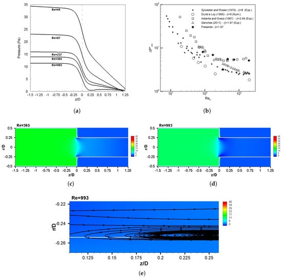The streamlines continue to curve downstream of the contraction to form a cross section where a minimum pressure and maximum velocity are obtained. This region is known as the vena contracta. The contracted flowing stream is surrounded by fluid that has very little forward motion. Downstream of the vena contracta the flow stream expands, the velocity decreases and the pressure rises []. Associated with these changes in pressure are increased erosion rates as well as increased heat and mass transfer rates in the regions where flow separation occurs. From the range of Reynolds numbers simulated, the presence of the vena contracta was notice at , where a maximum velocity and minimum pressure are obtained downstream of the contraction at the position  (Figure 3 and  Figure 5a), respectively. Expanded views on the pressure field at , associated with streamlines were also used to visualize the presence of the vena contracta, which is shown in Figure 5e. Durst et al. [] found the existence of the vena contracta for  when . Based on other works [,] it is possible to conclude that as the contraction ratio increases, the Reynolds number to obtain the vena contracta increases as well. Regarding the pressure losses caused by the sudden contraction, for the Reynolds numbers studied the results are given in Figure 5b. This figure also reproduces data by Astarita and Greco [], Sylvester and Rosen [], Durst et al. [] and Sanchez []. There are the same tendency of all works, as Reynolds number increases, the dimensionless pressure loss decreases. The pressure fields at  and 993 are shown in Figure 5c,d, respectively.