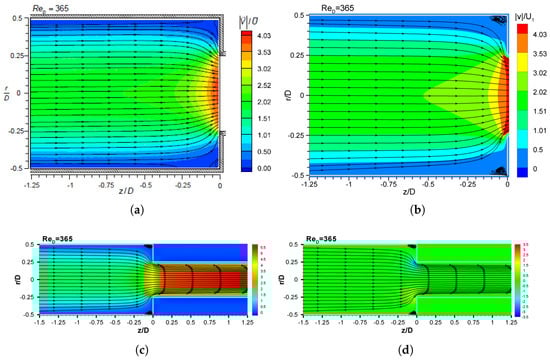 Streamline for  (a) upstream region for velocity magnitude [], (b) upstream regions for velocity magnitude (present work), (c) both regions for axial velocity and (d) both regions for radial velocity.