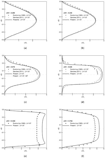 Even though the positions  and  are under the influence of the sudden contraction, this influence is quite weak, having a good agreement between the present result and the reference works (Figure 8a,b). Nearer to the sudden contraction, the influence increases, as shown at the position  (Figure 8c), where there is a good agreement between the cases where the contraction ratio and Reynolds number have the same values [] and the same tendency with the Durst et al. [] which has lower contraction ratio and slightly different Reynolds number. The difference results between the present work and Durst et al. [] relies on the contraction ratio and Reynolds number difference, once the present work has a higher contraction ratio it is expected higher velocity (Equation (26)).