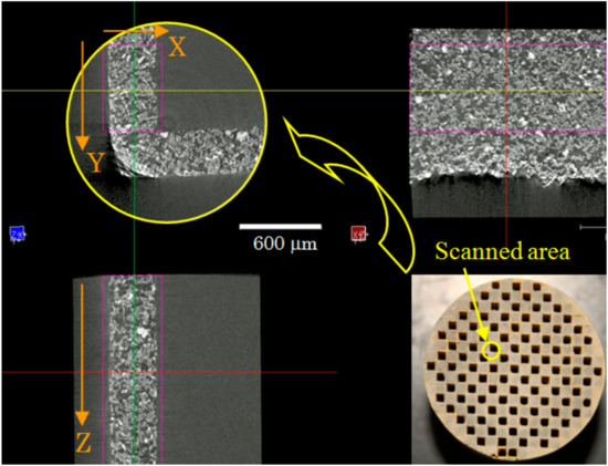 Our main advantage is that we would reproduce the exhaust gas flow in the real filter. Then, the data on the inner porous structure of the filter substrate was used in the simulation. Three materials of Al2TiO5, SiC, and cordierite with different porosity and pore size were tested. Table 1 shows filter properties of five samples. The porosity and the mean pore size were independently selected. In order to evaluate the flow field and the filter backpressure in the real filter, we applied the X-ray CT scanning. An example is shown in Figure 1, with the direct photograph of sample 1. As seen in the photograph, a part of the filter wall shown by the yellow circle was detected by the X-ray CT, and the three-dimensional substrate structure was obtained. In this figure, three slice images of sample 1 are shown. The coordinate system will be described later. The measurement resolution of the X-ray CT scanning was 1.42 μm/pix, which was the corresponding grid spacing in the numerical domain. Using CT data, it was possible to conduct the three-dimensional simulation to visualize the flow field inside the DPF. Since a part of the CT data was used in the simulation, convergence studies were conducted to set the proper numerical domain, which is explained later.