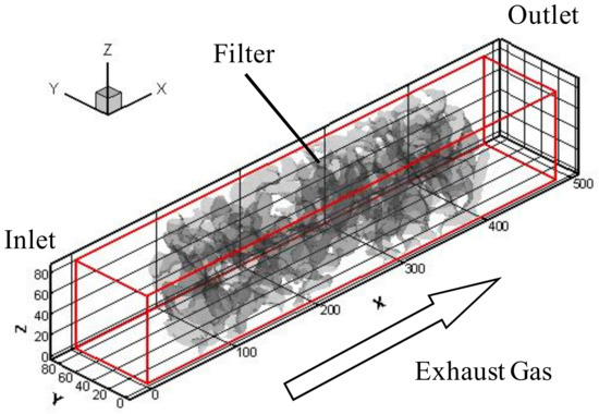 The boundary conditions are explained. At the filter inlet, the flow velocity (Uin) was given at 1 cm/s [13]. Different from previous simulations [13,14,16,19,20,21,22,23], only the flow was simulated, and the component of the exhaust gas was nitrogen. The temperature at the inlet (Tin) was 350 °C, which was used to determine the kinematic viscosity of the inflow. Each velocity component was set at ux = Uin, uy = 0, and uz = 0. On four side walls, we assumed the periodic structure of the porous material. Then, the slip boundary was adopted. At the exit (outlet), the pressure was always the atmospheric value. At the surface of the filter substrate, the nonslip wall boundary was used [27].