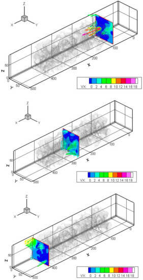 First, we visualized the flow field formed in the filter wall. Needless to say, the filter consisted of two or more interconnected porous substrates. Expectedly, the flow would be very complex inside the nonuniform structure of the filter wall. Figure 3 shows the flow velocity along X-direction at three different locations of sample 1. These were at X = 92, 255, 411 μm. The inlet width of W was 85 μm. It was seen that the flow was locally enlarged in the narrow area between pore spacing. Since the inlet velocity was 1 cm/s, the filtration velocity was much higher than the inflow velocity. Based on the flow trajectory inside the filter wall, it was found that there were a lot of stream paths along the filter substrate.