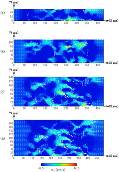 Distributions of velocity in X-direction of sample 1; (a) W = 57 μm; (b) W = 114 μm; (c) W = 142 μm; (d) W = 189 μm.