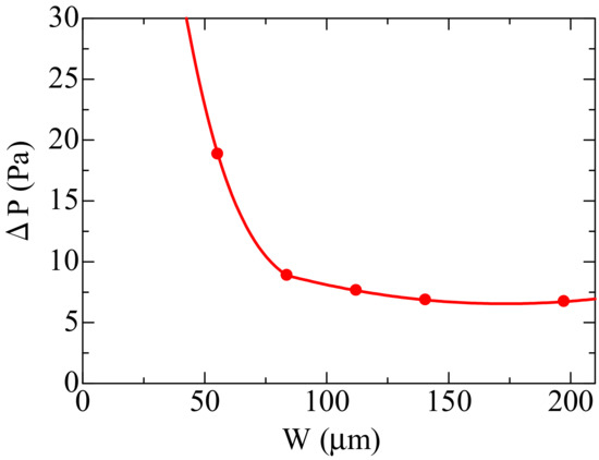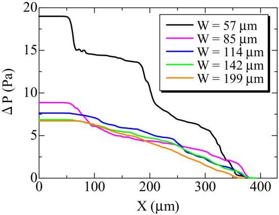 Results are shown in Figure 5. It is shown that when the inlet width was small, the pressure was largely varied. Especially, between four cases, the inlet pressure of the flow was quite different. As the inlet width was larger, the pressure at the inlet became lower. In other words, the filter backpressure was lower. Then, the filter backpressure was examined at the different inlet widths. Results are shown in Figure 6. It was found that, as W was increased, the filter backpressure became smaller, but it was saturated when W was greater than or equal to 85 μm. It should be noted that the same tendency was observed for the other four samples. It is considered that when the inlet area on the numerical domain was enlarged, more flow paths along the filter substrates appeared. However, the numerical domain was large enough, the similar velocity profile was observed, with the filter backpressure saturated. Hereafter, we set W to be 85 μm.